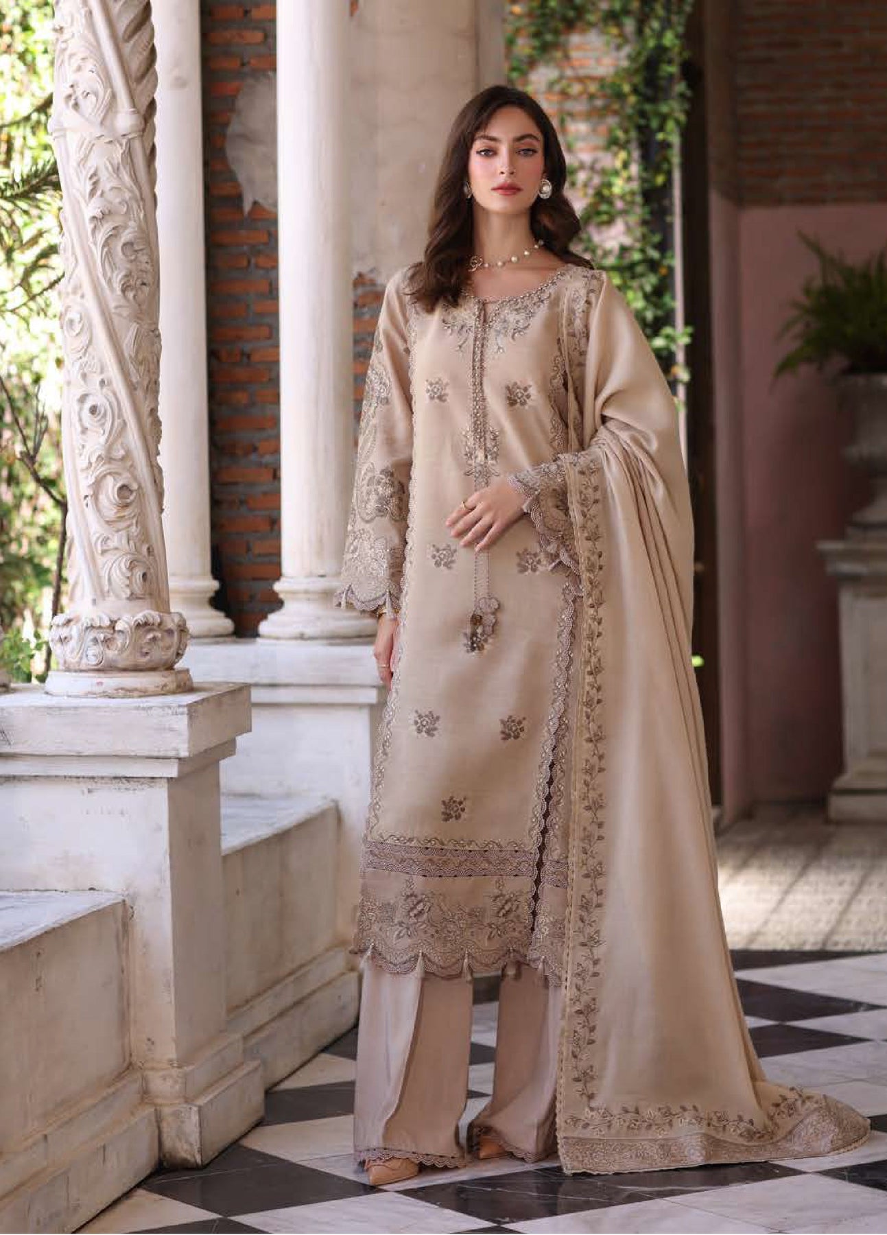 Noor by Saadia Asad Unstitched Linen Pashmina Shawl Embroidered Suits 3 Piece NSA25PW D12-Caramel Mist - Casual Collection