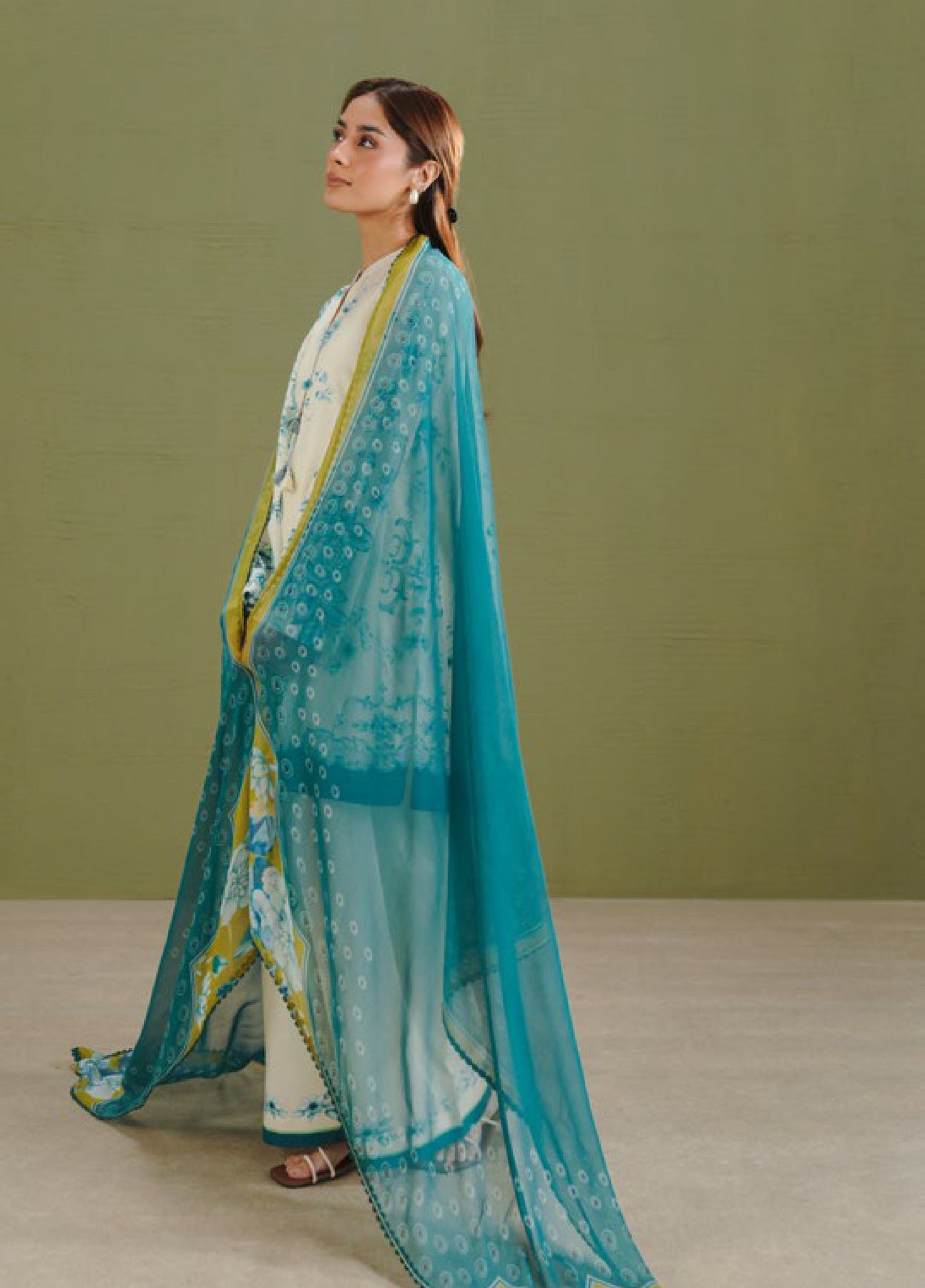 The dupatta is printed with polka dots and gara-inspired motifs in teal and olive green. The shirt showcases a blue gara floral print on an off-white base. The trouser is detailed with a blue gara floral border on off-white.
