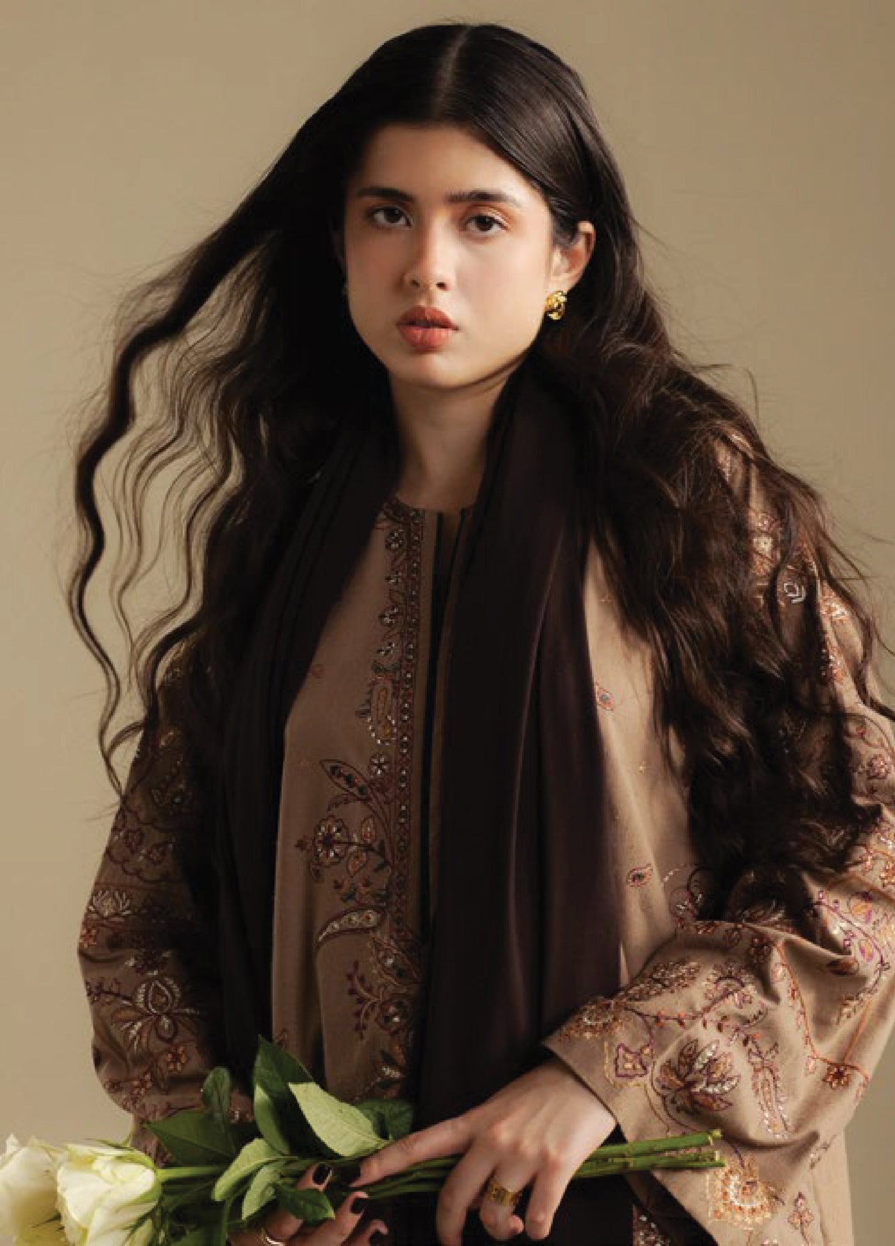 A coffee beige karandi shirt and trouser paired with a chocolate brown shawl, a cozy winter duo grounded in warmth and ease.