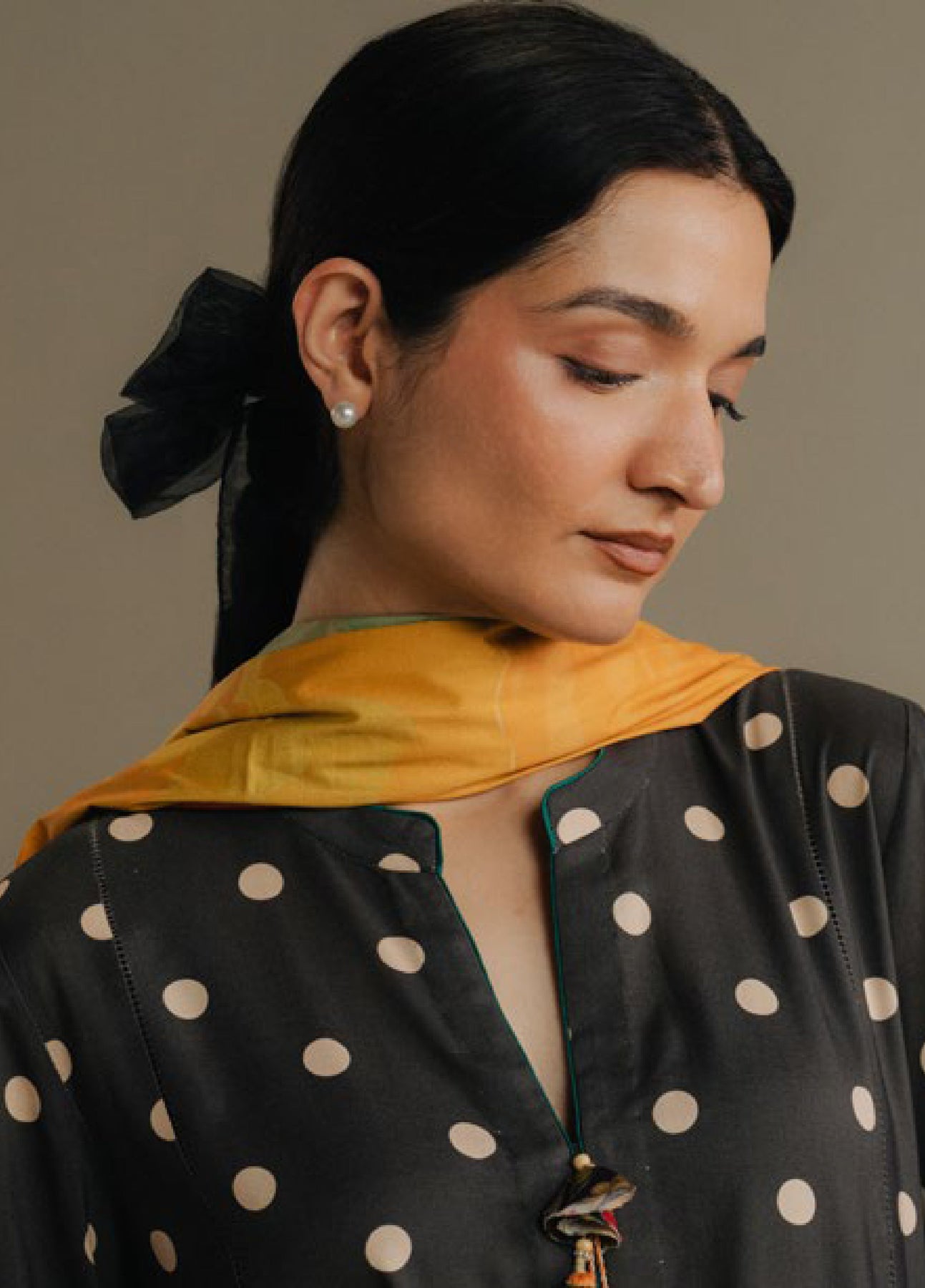 A gray shirt featuring a charming mix of paisley and polka dot patterns, paired with an off-white trouser adorned with delicate floral prints. The look is completed with a multi colored shawl inspired by traditional pashmina designs, adding warmth, texture, and a touch of timeless elegance.