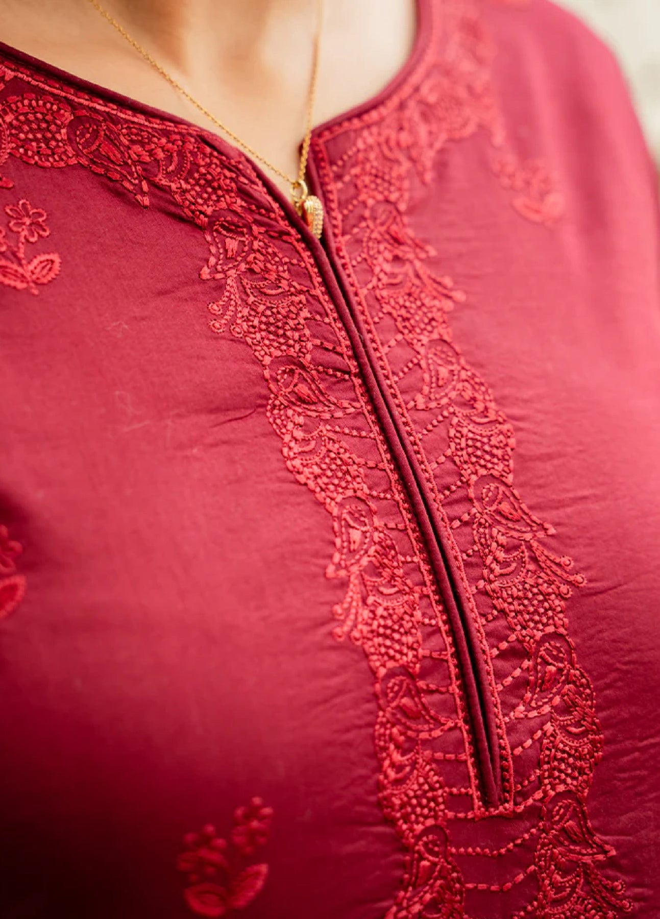 Zyra is a striking two-piece set in a bold red base, crafted from premium lawn. The shirt is beautifully embroidered, exuding timeless elegance, while the embroidered lawn borders on the front and sleeves add refined detail. Paired with a complementing cotton trouser, Zyra is a perfect balance of vibrance and sophistication, making it an essential addition to your wardrobe.