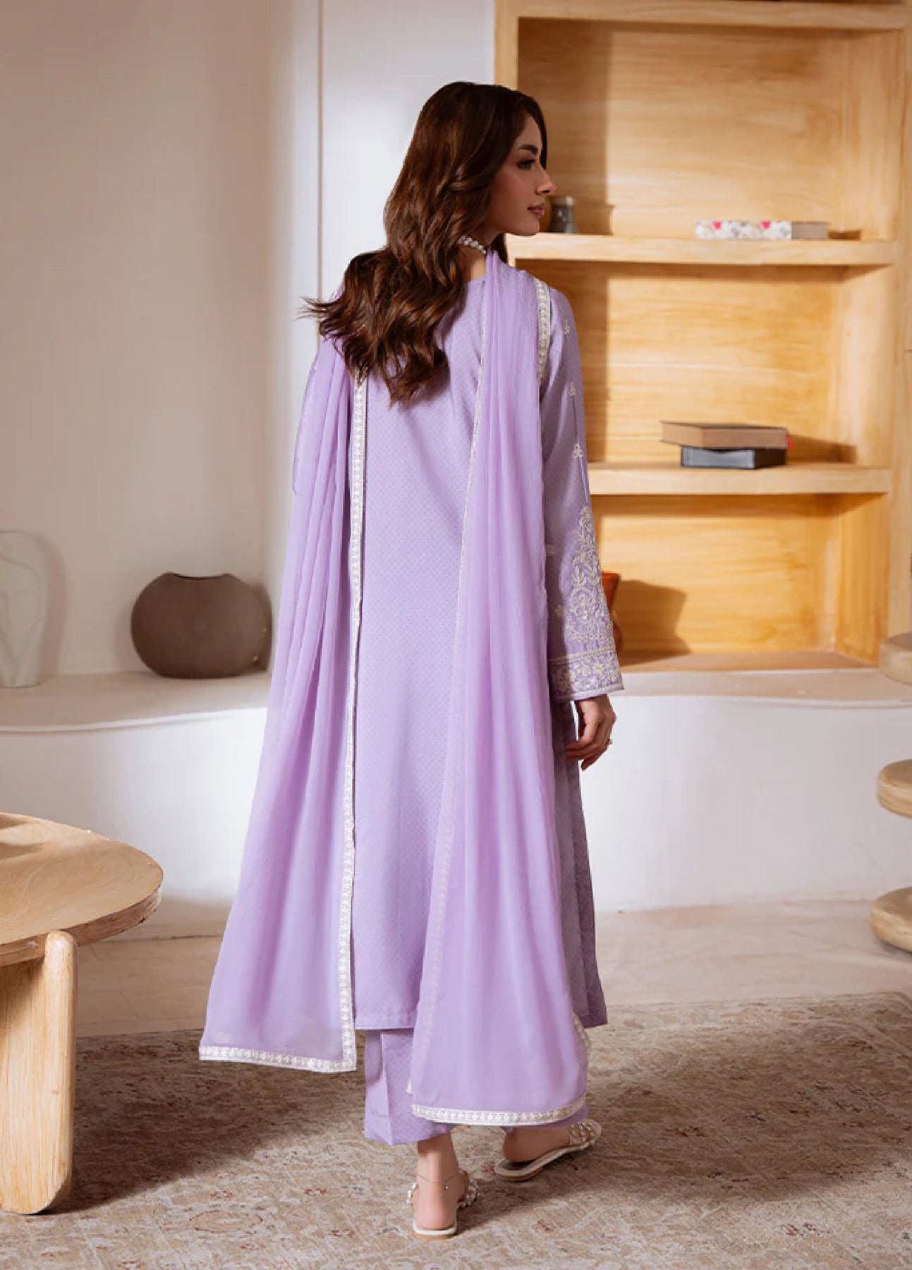 Lavender Mist is a dreamy three-piece outfit designed in premium poly lawn fabric in a soft light purple hue. Delicate white floral thread embroidery adds timeless grace, while the chiffon dupatta is beautifully finished with embroidery on all four sides, lending an elegant touch of detail. Paired with a playful polka dot printed trouser, this ensemble blends sophistication with subtle charm, making it a perfect choice for effortless daywear.
