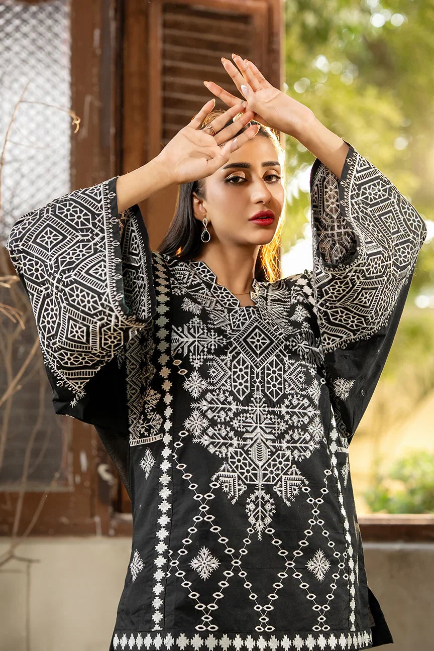 This article consists of a solid 2-piece set with an intricate embroidery detail touch on the shirt and trousers. The outfit consists of a mid-length style shirt and fitted pants.