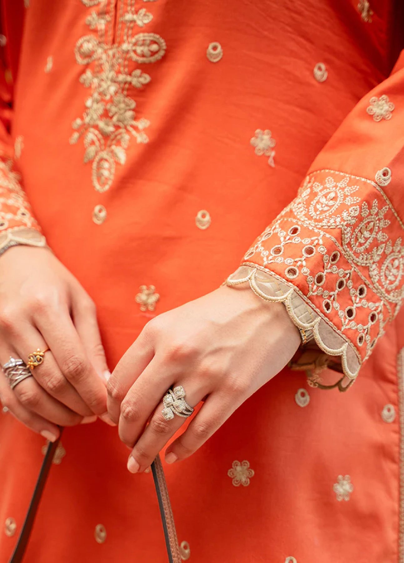 Sunstone is a radiant three-piece ensemble in a rich rust base, crafted from premium lawn. The shirt is fully embroidered, showcasing intricate patterns that highlight timeless craftsmanship. Chikankari embroidered lawn borders on the shirt and sleeves add delicate finesse, while the dyed chiffon dupatta with an embroidered organza border brings a graceful finishing touch. Paired with a comfortable cotton trouser, Sunstone is the perfect choice for effortless sophistication.