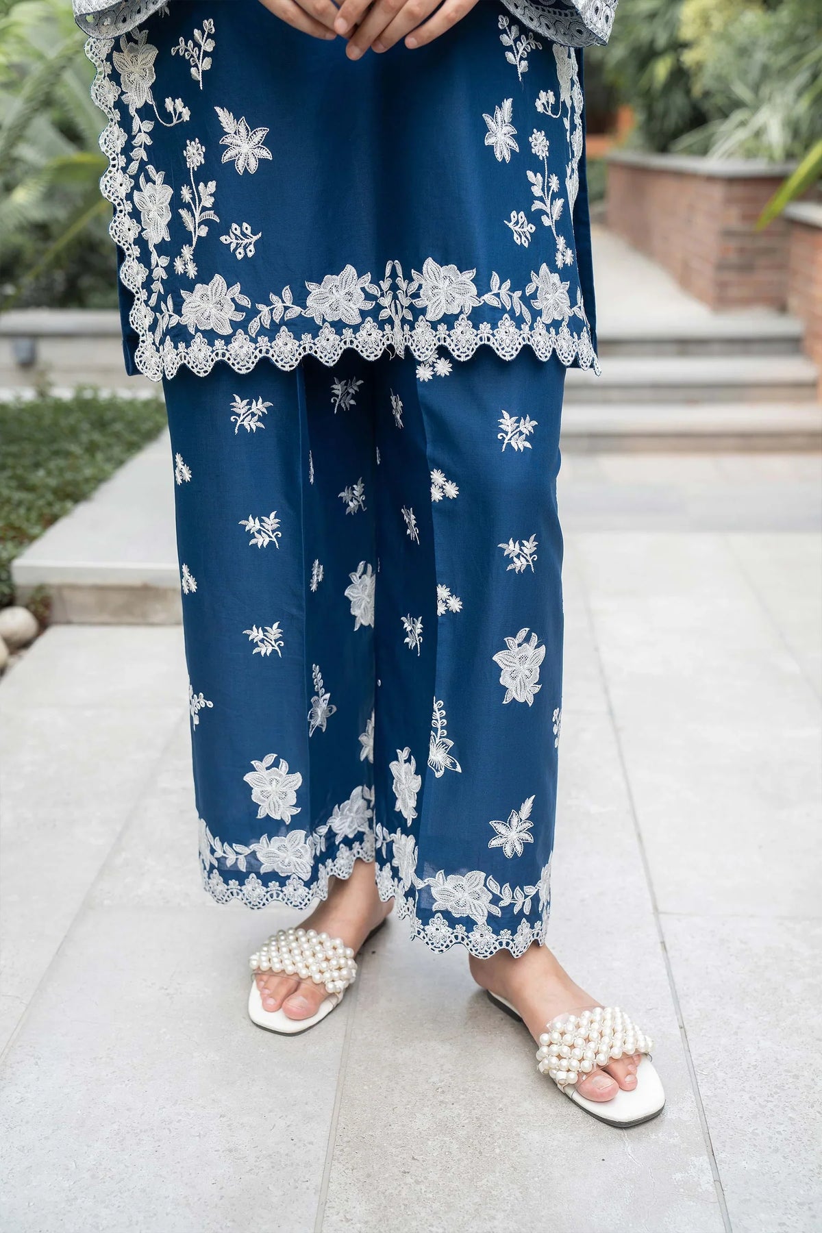 The Blue Petal Lawn Embroidered 3 Piece Stitched set showcases a serene blue cotton lawn shirt adorned with intricate Scheffli embroidery, blending comfort with refined craftsmanship. Complemented by matching cotton lawn embroidered bell bottoms, this ensemble offers a graceful silhouette with detailed elegance, perfect for stylish and sophisticated wear.
