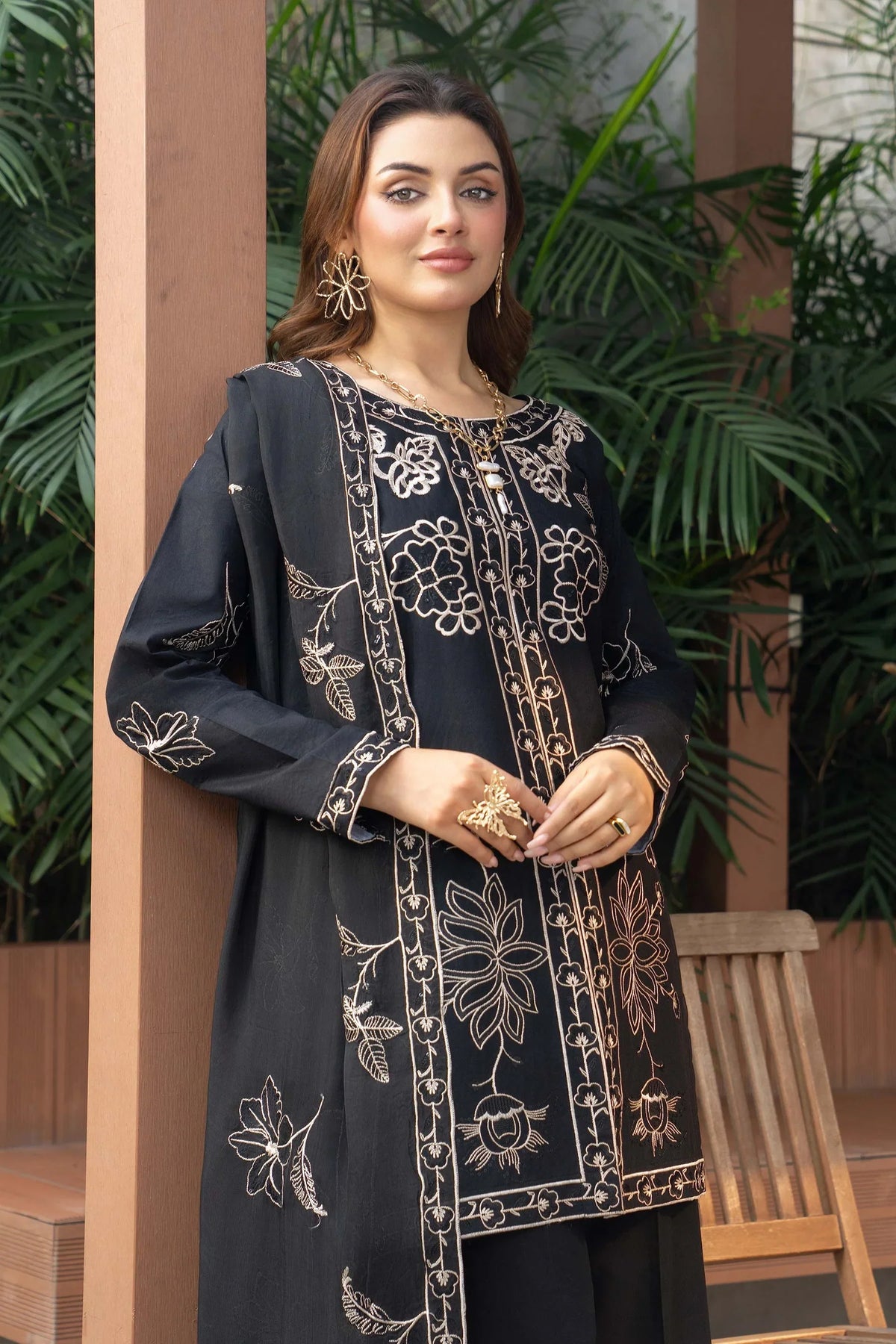 The Rhea Lawn Embroidered 3 Piece Stitched set in classic black features a cotton lawn shirt adorned with delicate sequin embroidery, adding subtle shimmer and sophistication. Paired with a matching cotton lawn bell bottom, it offers a flattering and comfortable fit. The silk embroidered dupatta completes the ensemble with a luxurious touch, perfect for elegant occasions.