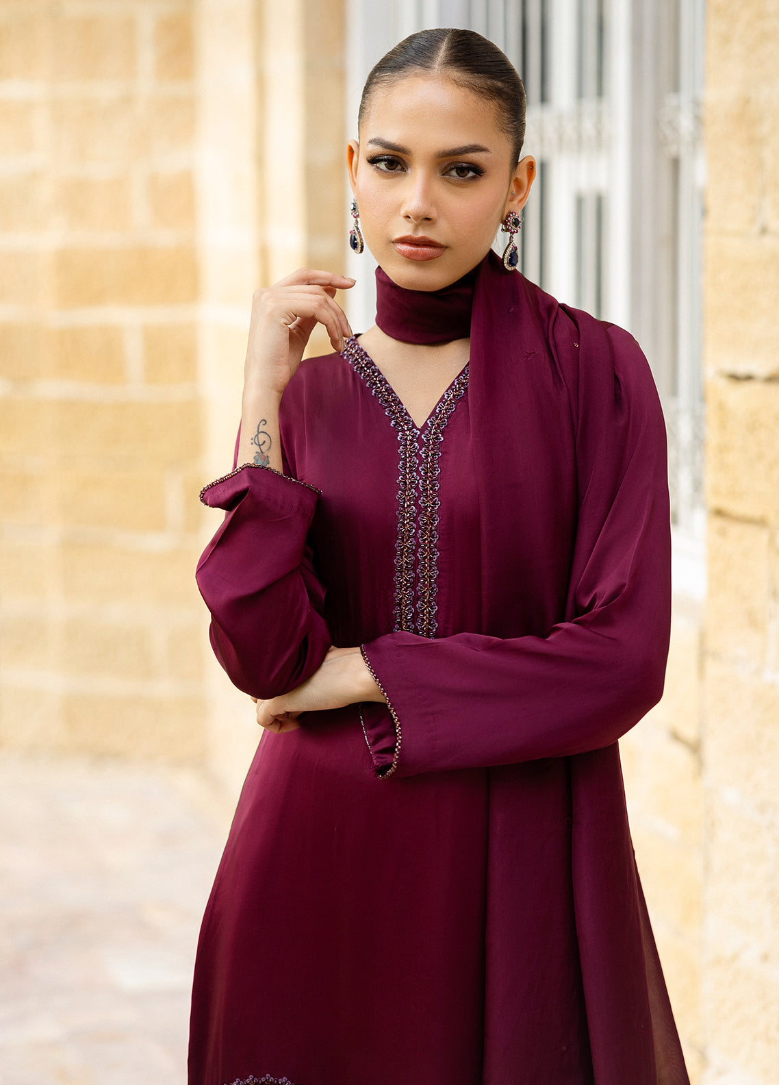 Shamose silk shirt with hand embellished neckline, sleeves and organza patch on shirt hem; paired with straight silk pants. The look is completed with Amur Silk dupatta with adda spray.