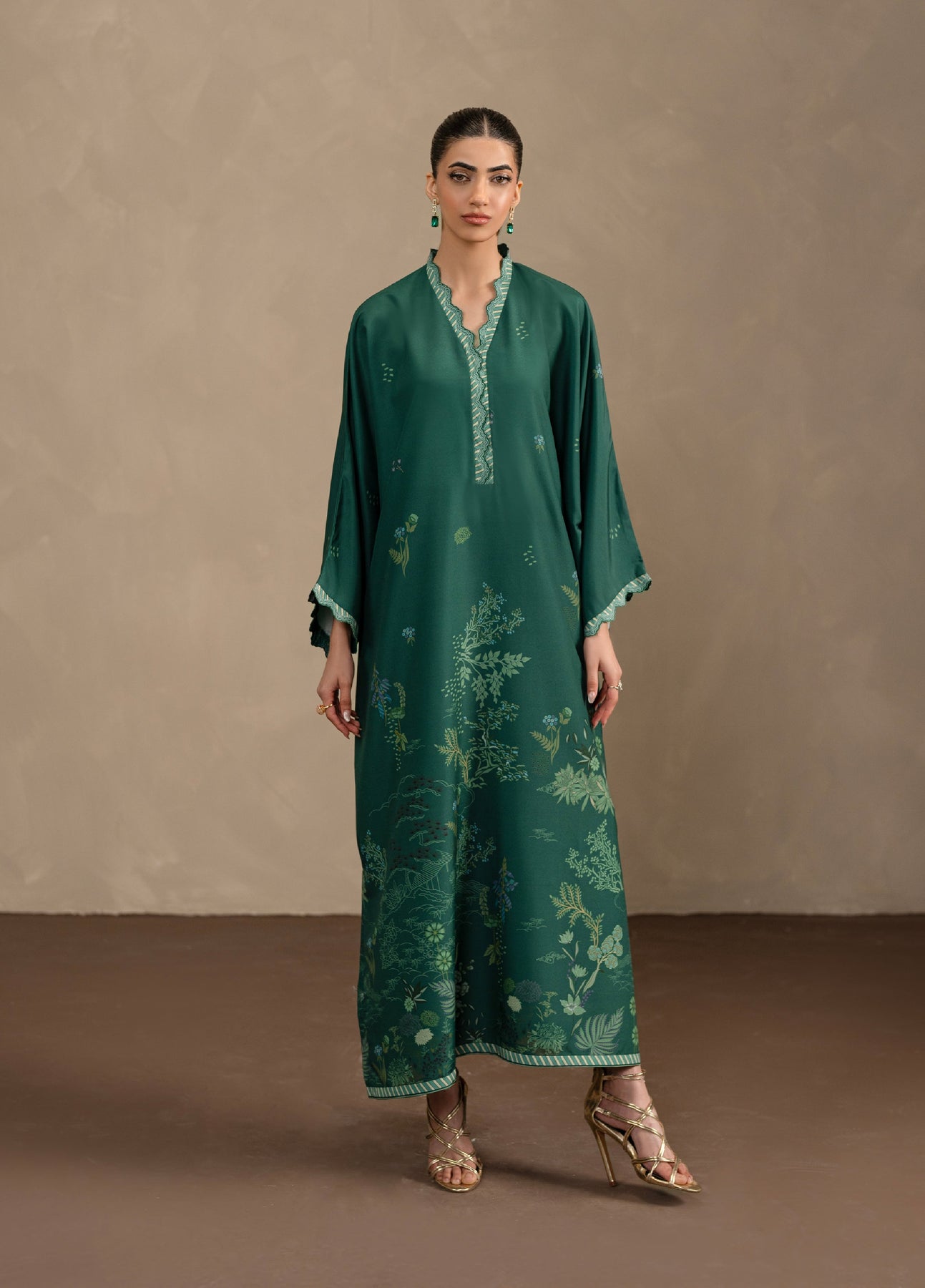 Verdara is a fluid Kaftaan crafted from soft poly cambric, presented in a rich deep forest green hue. The Kaftaan features an all-over botanical print in muted tones of sage green, olive, soft blue, and subtle ivory, creating a calm, nature-inspired aesthetic. Fine scattered motifs and a delicately detailed neckline add depth while keeping the look understated. Finished without tassels, the silhouette feels clean and composed, offering a serene, elegant vibe that’s effortless and timeless—perfect for relaxed, everyday sophistication.