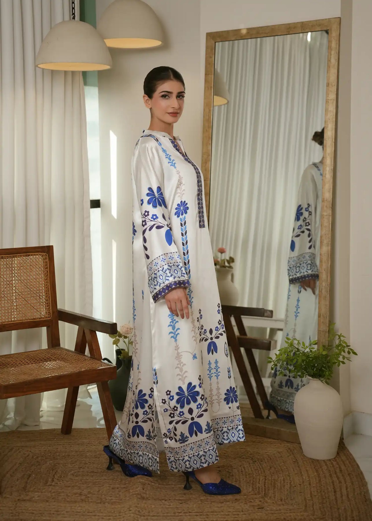 Channel timeless sophistication with Porcelain Bloom. This breathtaking ankle-length silhouette features a lustrous white base beautifully contrasted by intricate blue floral and geometric motifs, reminiscent of classic ceramic art. The design is elevated by a detailed central neckline placket embellished with subtle crystal accents, and finished with wide statement cuffs featuring a striking mosaic-style border.