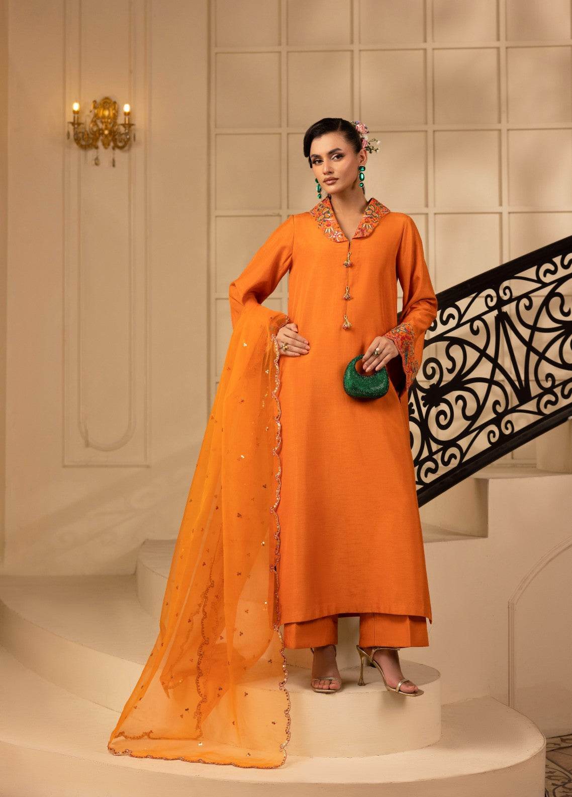 Radiate festive elegance in this orange drop-corner Korean raw silk shirt, featuring a slight V-collar neckline with floral multicolor embroidery and delicate curtain-style tassels. The bell sleeves, highlighted with fine multicolor thread embroidery, add a playful yet graceful finish. The outfit is paired with Korean raw silk trousers for a sleek, refined look and an organza dupatta beautifully enhanced with sequence embroidery, creating the perfect blend of color, texture, and sophistication. Ideal for festive days and formal wear.