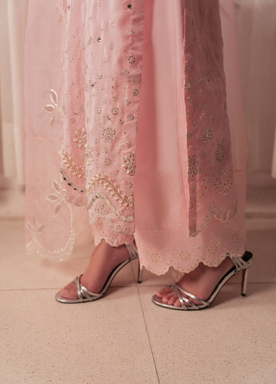 BLOSSOM is crafted from pure ramen silk in a delicate pastel pink hue. The shirt is meticulously adorned with hand-embellished pearls and crystals, complemented by intricate thread and sequin embroidery that catch the light with every movement. Graceful loop button detailing enhances its timeless femininity, while matching embroidered pants mirror the artistry. The look is completed with an ethereal organza dupatta featuring scalloped, sequin-embroidered borders and exquisite cutwork — a perfect harmony of sophistication and grace.