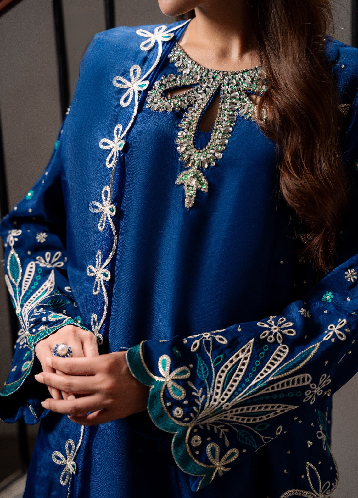 DIVA is crafted from pure ramen silk in a captivating midnight blue hue. The shirt features a hand-embellished neckline sparkling with crystals, sequins and beads, radiating refined opulence. Intricate sequin and thread embroidery grace both the front and back, creating a striking silhouette from every angle. Paired with matching pants and an organza dupatta finished with scalloped, sequin-embroidered borders and delicate schiffli work — DIVA embodies effortless sophistication and timeless allure.