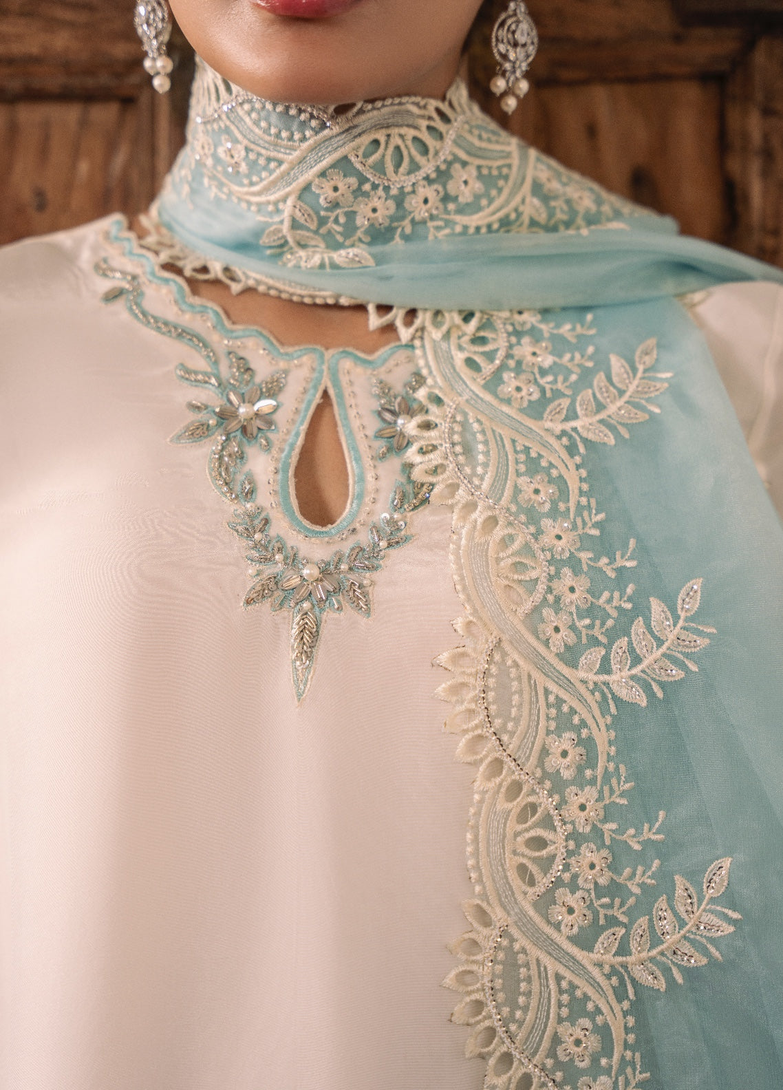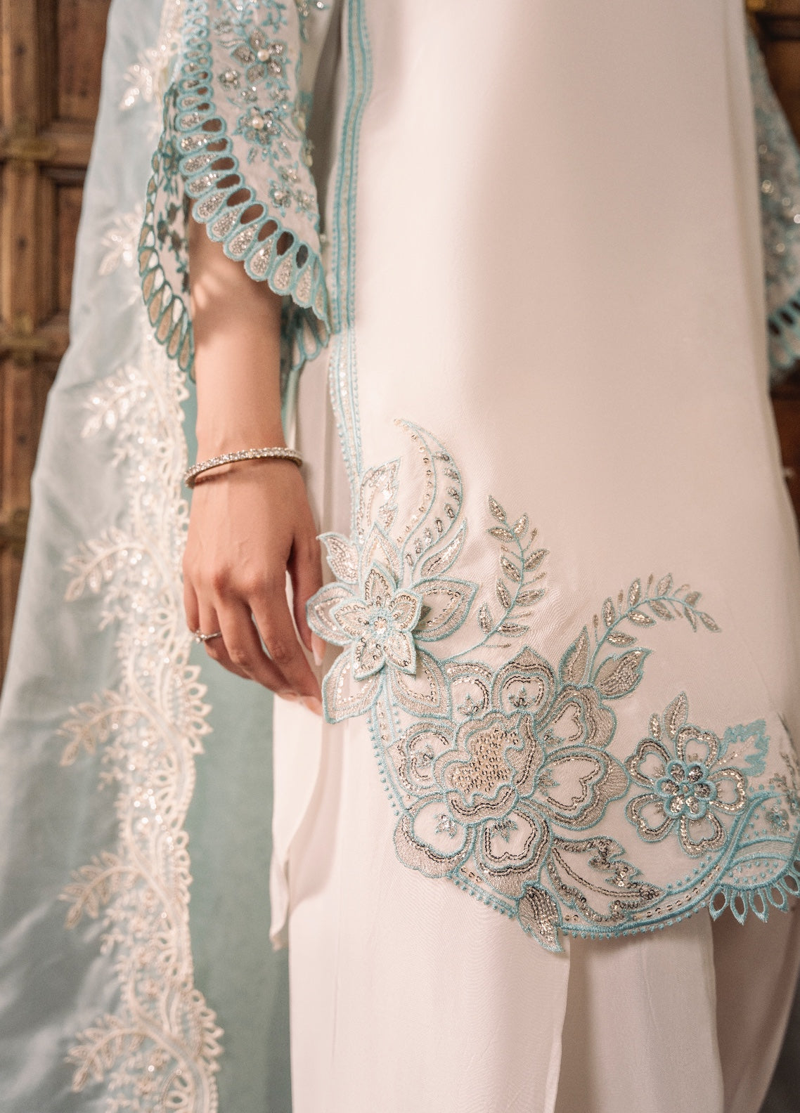 TWINKLE is crafted from pure ramen silk in pristine white with delicate powder blue accents, exuding ethereal elegance. The shirt features a hand-embellished neckline and sleeves, adorned with pearls, dabka, cutdana and sequins, complemented by thread and sequin embroidery, meticulous cutwork, and 3D floral embroidery on the hem. Paired with a matching fused farshi shalwar featuring embroidered and sequined hems, and a contrasting powder blue organza dupatta with scalloped, sequin-embroidered borders and intricate cutwork — TWINKLE is a luminous ensemble that captures timeless sophistication and grace.