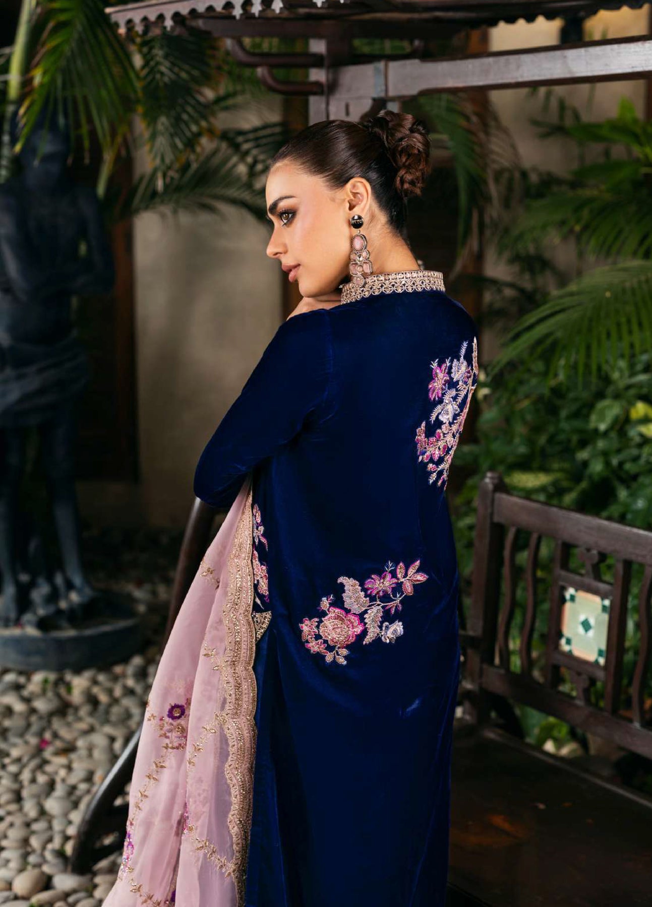A luxury unstitched three-piece ensemble crafted from sumptuously soft midnight blue velvet. The rich, deep hue of the velvet serves as a perfect canvas for the intricate floral embroidery that gracefully adorns the front open jacket style shirt. Delicate patterns in shades of blush pink, muted gold, and hints of silver embellish the neckline, sleeves, and extended borders, reflecting meticulous craftsmanship. The raw silk trousers are tastefully detailed with matching embroidered motifs at the cuffs, creating a cohesive and polished look. Completing this regal attire is a mesmerizing powder pink organza dupatta, beautifully edged with a thin contrast border.